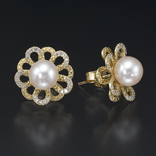 עגילי פנינה פרחוניים משובצים יהלומים איכותיים